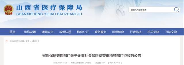10月30日 北京、上海、山東、山西、湖南、四川、貴州、吉林、江西等地同時(shí)發(fā)布了《關(guān)于企業(yè)社會(huì)保險(xiǎn)費(fèi)交由稅務(wù)部門(mén)征收的公告》的通知。