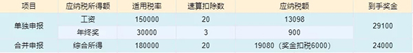 對小明來說,兩種計稅方式下,年終獎選擇單獨申報更有利,到手的年終獎多了5100元。