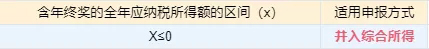 1、當(dāng)年收入(含年終獎)減去6萬及三險一金、附加扣除等后應(yīng)納稅所得額≤0