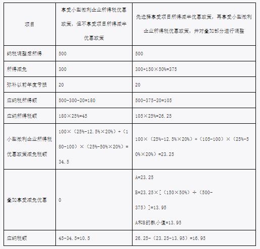 ▲在例1、例2情形下,企業(yè)應(yīng)選擇同時享受項(xiàng)目所得減半和小型微利企業(yè)優(yōu)惠政策。